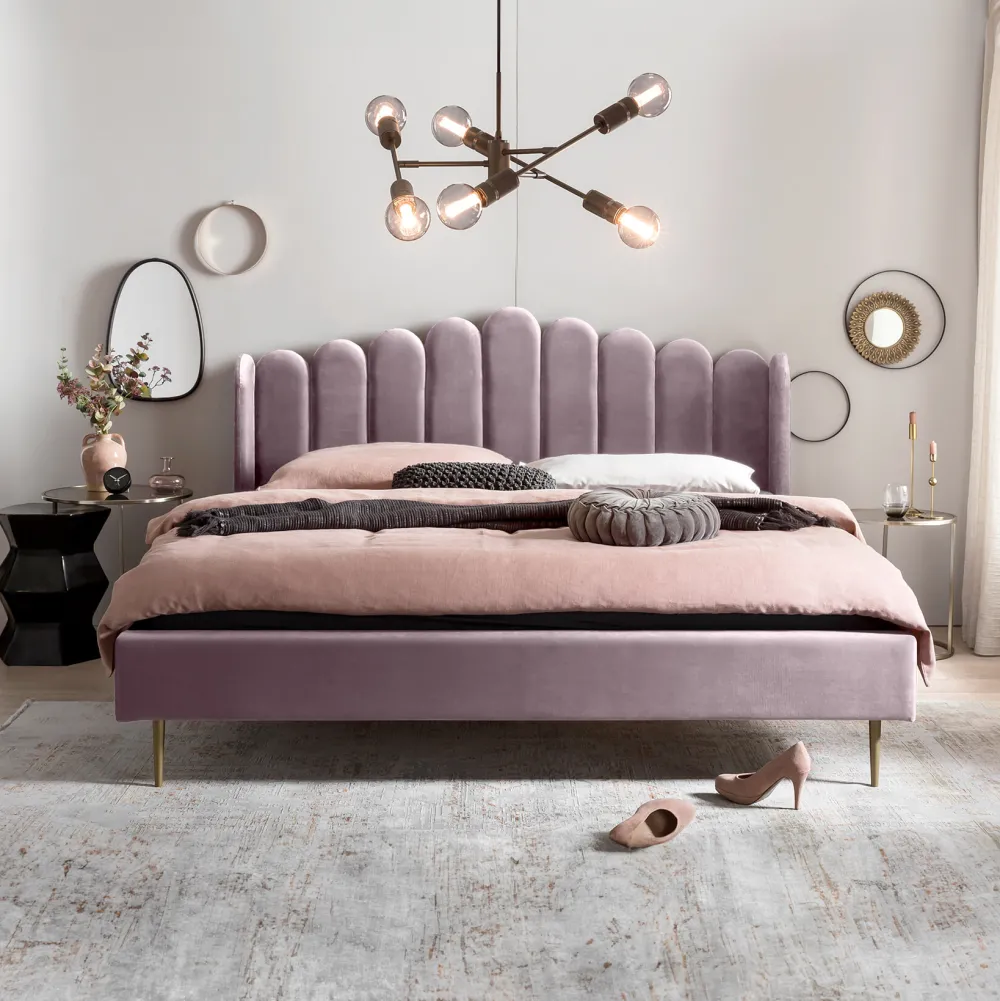 Ontsnap aan het dagelijks leven en geniet van een beetje time out. Het moderne gestoffeerde bed in schelpdesign boeit met zijn overtrek van fluweel en overtuigt met zijn uitvoerig bewerkte hoofdeinde. Het 4-poots frame van goudkleurig chroom zorgt niet alleen voor een veilige stand, maar biedt ook een geweldig contrast met de bekleding van het bed. De bodemvrijheid van 18 cm creëert extra opbergruimte onder het bed. De afgeronde vorm van het hoofdbord zorgt voor een zachte uitstraling. Dit schelpenbed is een echt juweeltje en zal niet alleen een visueel hoogtepunt zijn in je slaapkamer, maar ook je nieuwe feel-good plek voor ontspannen nachten.