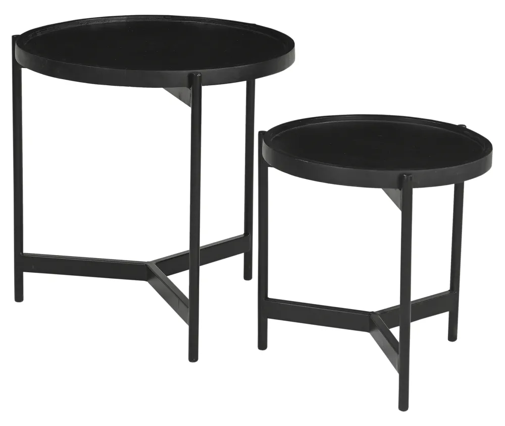Deze bijzettafelset van massief zwart mangohout en een zwart metalen frame combineert modern design met praktische functionaliteit. De twee tafels in verschillende maten bieden een veelzijdige manier om stijl en opbergruimte in je huis te integreren. Door de verschillende maten kun je de tafels naar wens naast elkaar of op verschillende plekken in de kamer zetten om veelzijdig gebruik te creëren – als opbergruimte, voor decoratie of als praktische bijzettafel voor drankjes en hapjes. De tafelbladen zijn gemaakt van massief mangohout in elegant zwart, wat de tafels een natuurlijke, warme uitstraling geeft. Het zwarte metalen frame zorgt voor een moderne, industriële look en biedt tegelijkertijd stabiliteit en duurzaamheid. Deze combinatie van hout en metaal geeft de tafels een tijdloze elegantie die perfect past in verschillende interieurstijlen. In de woonkamer als opbergruimte, in de gang als decoratieve tafel of in de slaapkamer als nachtkastje – de set past harmonieus in elke kamer en elke interieurstijl. Het eenvoudige, maar opvallende ontwerp maakt het een flexibel meubelstuk dat er goed uitziet in verschillende omgevingen.