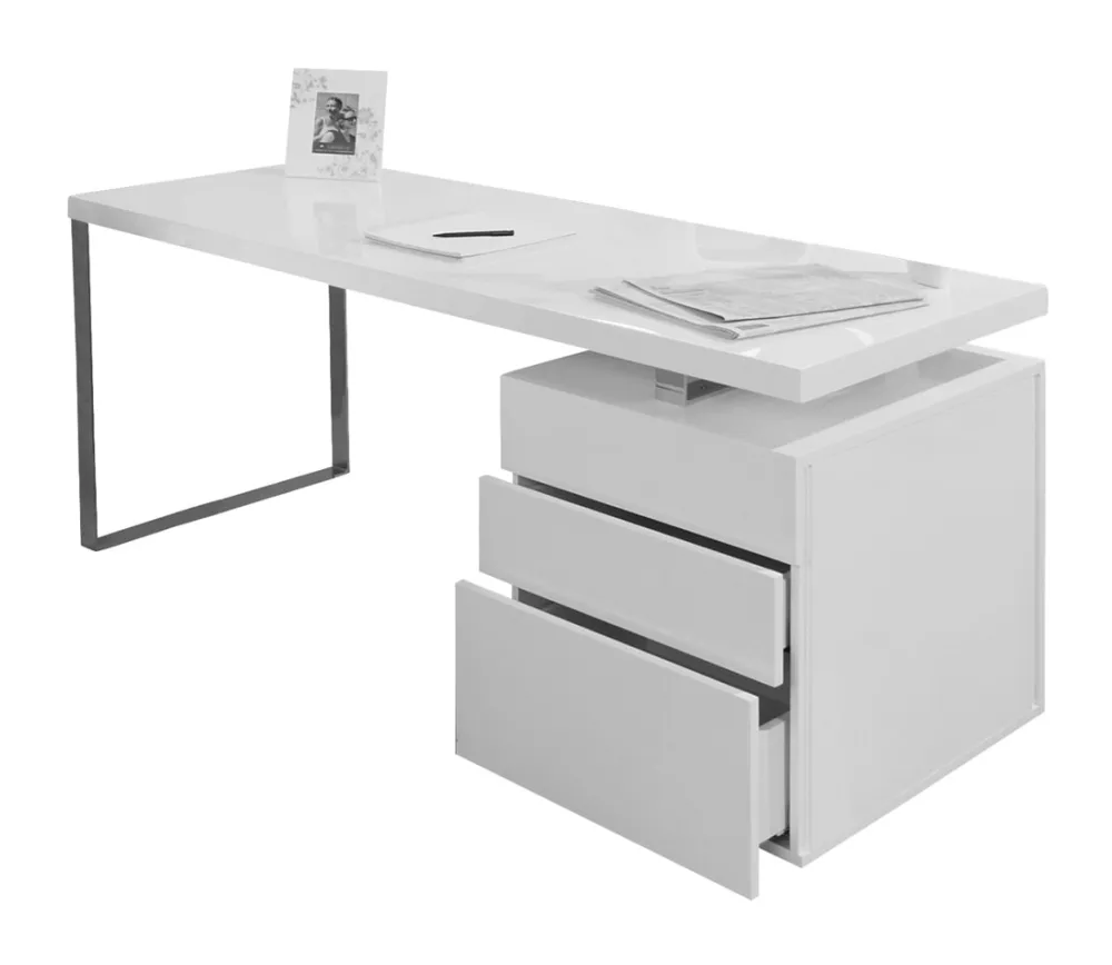 Creëer ruimte in je kantoor met dit ruime bureau. Het bureau is gemaakt van MDF en gelakt met een hoogglans witte laag. Aan de linkerkant ondersteunt een verchroomd frame het tafelblad. Aan de rechterkant bevindt zich een bak met drie laden. Deze laden hebben een soft-close functie en zijn van verschillende grootte. Hier is voldoende opbergruimte voor diverse kantoor- en werkmaterialen.