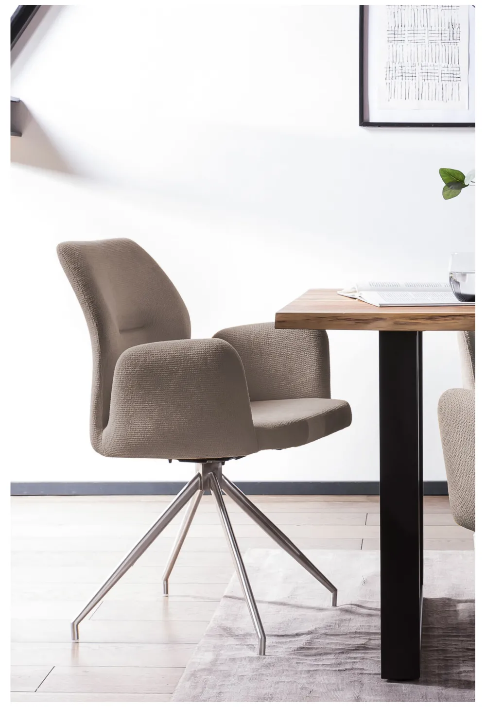 Maakt indruk met zijn moderne look en hoogwaardige afwerking: het moderne ontwerp van de fauteuil met 180° draaifunctie past perfect in je interieur. Hij kan worden gebruikt als veelzijdige eetkamerstoel, voor de kaptafel of het thuiskantoor. De gestoffeerde stoel maakt indruk met zijn trendy ontwerp met ergonomisch gevormde rugleuning met decoratieve stiksels, rechte zitting en licht uitlopende armleuningen. Alle delen zijn aangenaam gestoffeerd voor een hoog zitcomfort. De zitting is bekleed met een elegante structuurstof met slijtvaste eigenschappen en is verkrijgbaar in een reeks aantrekkelijke effen kleuren. Een ander hoogtepunt is het filigraan ogende designframe van roestvrij staal. Het geïntegreerde draaimechanisme zorgt ervoor dat de fauteuil dynamisch zit.