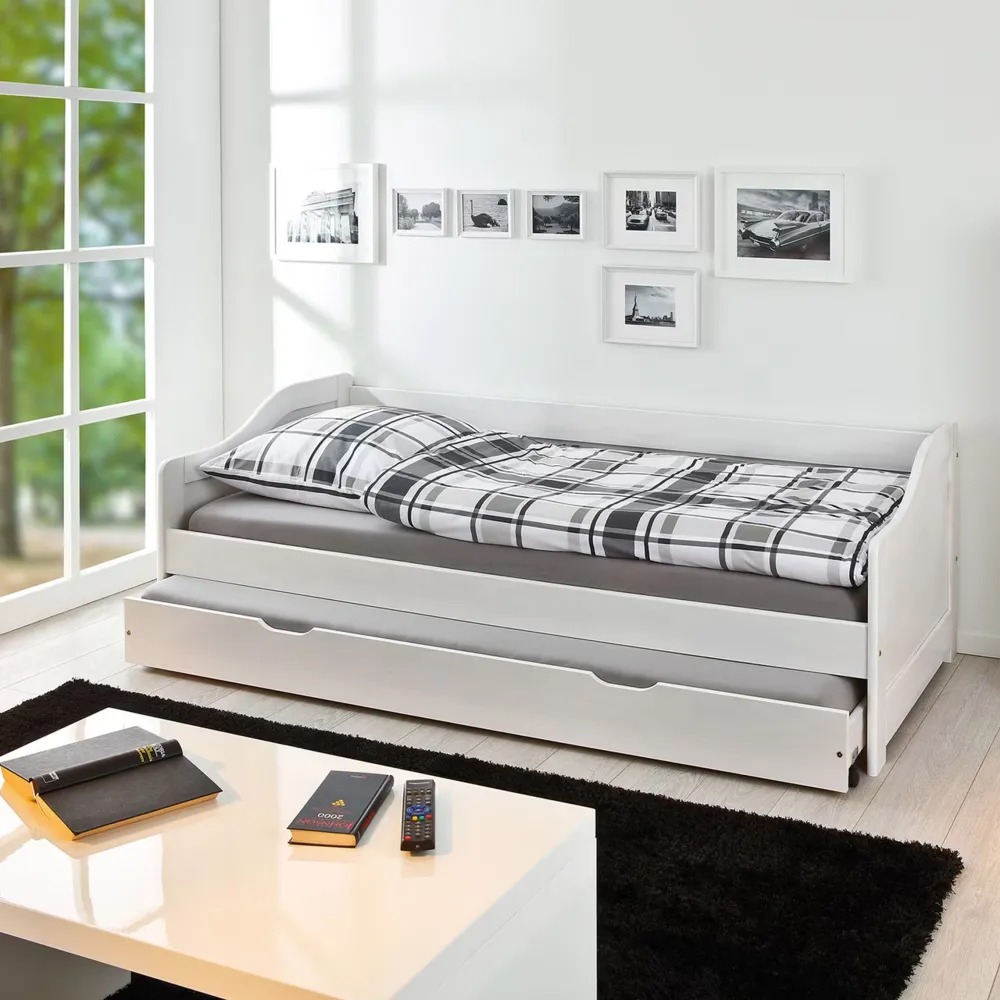 Kinderkamermeubels die interessant en speels zijn, zijn bijzonder populair bij kleine liefhebbers van interieurdesign. Het eenpersoonsbed, geschikt voor matrassen van 90×200 cm, biedt extra ruimte voor logés. Het bed heeft een lade die kan worden gebruikt als extra opbergruimte om speelgoed, kleding of beddengoed in op te bergen, of kan worden omgebouwd tot een praktische tweede slaapplaats met een extra matras. De bedlade loopt op wieltjes, waardoor het kinderspel is om te verplaatsen. Ouders zullen ook blij zijn met het bed dat gemaakt is van massief grenenhout. Door de robuustheid van het hout kan het bed je kinderen tot op hoge leeftijd van dienst zijn. Het eenpersoonsbed met extra bed is ook een geweldige keuze voor logeerkamers en kleine appartementen. De witte afwerking past harmonieus in veel interieurs.