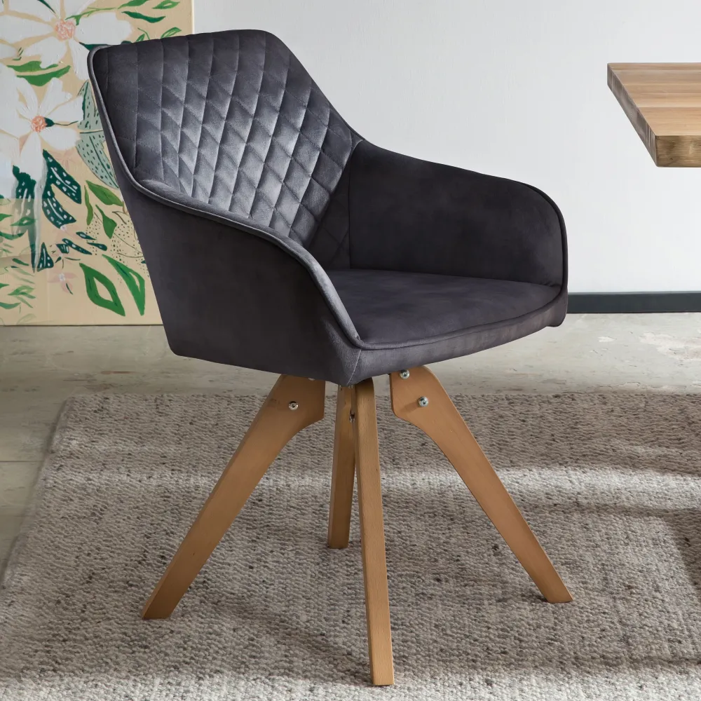 Vintage gevoel voor de woonkamer! De verfijnde fluwelen stoel past zich perfect aan je interieur aan. De hoogwaardige bekleding van zwart fluweel met glanzende afwerking is tijdloos elegant. De rugleuning en de armleuningen zijn afgerond, het ruggedeelte is voorzien van ruitvormige quilting – een echte blikvanger. Het design frame van de naturelkleurige poten van massief beuken zorgt voor een stevige stand en een hoog zitcomfort. Een bijzonder hoogtepunt is de 180 draaibare plaat onder de zitting. Deze stoel is een verrijking voor elke eet- en woonkamer en verfraait je pand visueel. Het zitcomfort is onbeschrijfelijk! Maar ook als losse fauteuil die vrij in de ruimte staat, is dit meubel een absolute blikvanger.