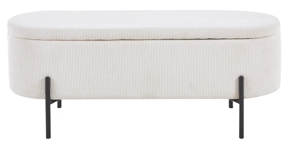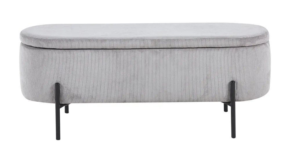 Als je op zoek bent naar Scandinavisch design met praktische voordelen, dan is deze bedbank met trendy koordhoes de juiste keuze. De gestoffeerde kruk scoort niet alleen met zijn vooruitstrevende ontwerp, maar biedt ook een slimme opbergfunctie achter het opklapbare deksel. Of het nu gaat om dekens, dekbedovertrekken of kleding – je kunt op een stijlvolle manier orde scheppen in de bedbank en rondslingerende spullen opbergen. De zachte corduroy stof geeft de bedbank een moderne uitstraling en zorgt voor een interessante look met de karakteristieke naden. Het design frame met hoge poten is gemaakt van gepoedercoat zwart metaal en maakt de look helemaal af.