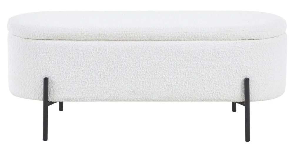 Als je op zoek bent naar Scandinavisch design met praktische voordelen, dan is deze bedbank met trendy bouclé bekleding de juiste keuze. De gestoffeerde kruk scoort niet alleen met zijn vooruitstrevende design, maar biedt ook een slimme opbergfunctie achter het opklapbare deksel. Of het nu gaat om dekens, dekbedovertrekken of kleding – je kunt stijlvol orde scheppen in de bedbank en rondslingerende spullen opbergen. De bouclé stof, die allang zijn weg heeft gevonden naar onze woon- en slaapkamers, straalt warmte en geborgenheid uit. Bovendien weerspiegelt de stof met zijn wollige look vakkundig de essentie van de populaire Scandi-stijl. Het designframe met hoge poten is gemaakt van gepoedercoat zwart metaal en maakt de look helemaal af.