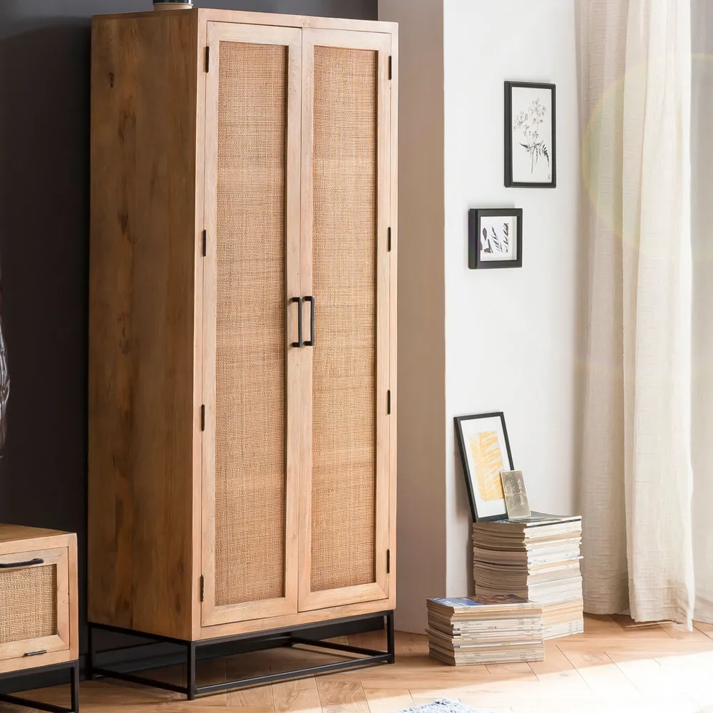 De kledingkast Denice van Artistiq is gemaakt van hoogwaardig mangohout en voorzien van elegante rattan deuren. Het hout geeft de kast warmte en karakter, terwijl het rattan zorgt voor een luchtige uitstraling. Achter de dubbele deuren is voldoende ruimte om kleding en textiel netjes op te bergen.