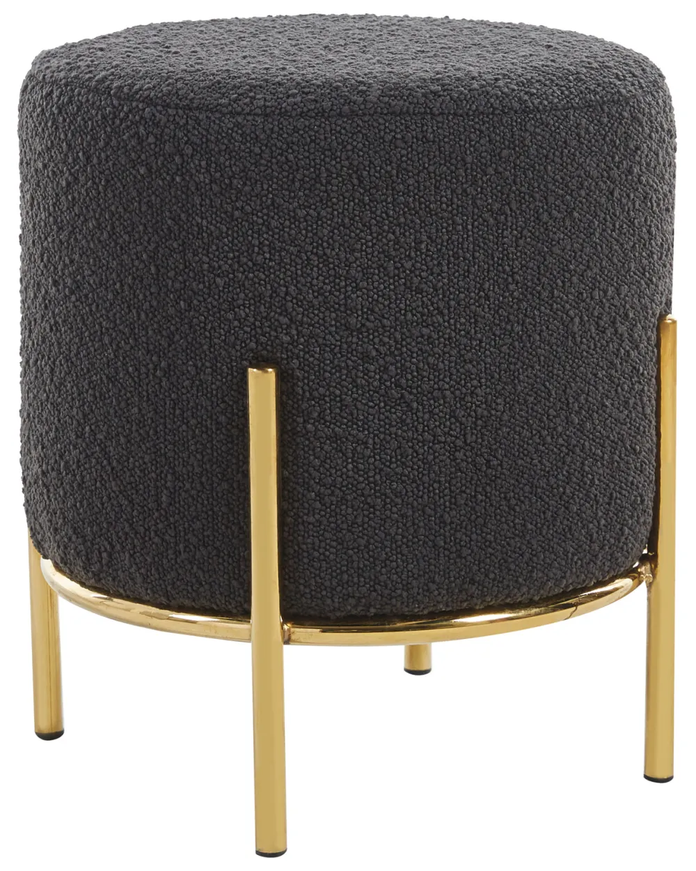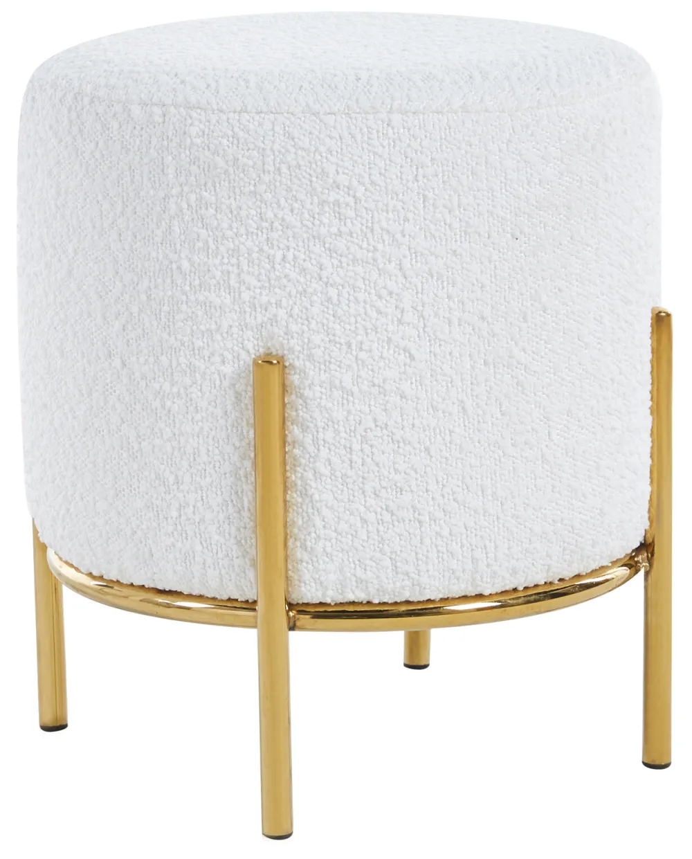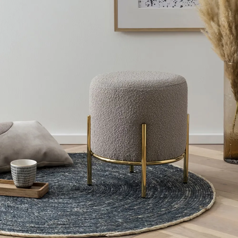 Als er spontane gasten komen, is extra zitruimte altijd een welkome zegen. Als dit er dan ook nog stijlvol uitziet en ruimtebesparend nut creëert, dan heb je een ideale design metgezel voor bank en zithoek. De kruk in bouclé-look met een diameter van de zitting van 35 cm biedt precies deze combinatie van aantrekkelijk uiterlijk en functioneel gebruik. Hier kun je extra gasten op laten zitten of je voeten opleggen in volledige ontspanning. De bouclé stof, die allang zijn weg heeft gevonden naar onze woon- en slaapkamers, straalt warmte en geborgenheid uit. Bovendien weerspiegelt de stof met zijn wollige look vakkundig de essentie van de populaire Scandi-stijl. Het designframe met hoge poten is gemaakt van goudkleurig metaal en maakt de look helemaal af.