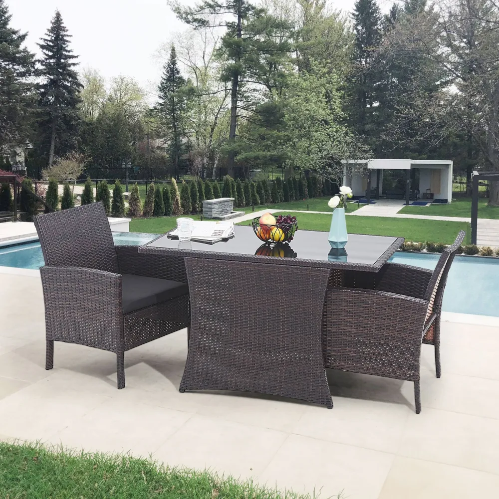 Bij mooi weer buiten in de tuin zitten met familie of vrienden, koffie met gebak en de wereld is perfect. Geniet van het comfortabele zitcomfort van deze lounge. Deze stabiele en weerbestendige zitgroep van polyratten met 2 comfortabele fauteuils inclusief zitkussens en een tafel met een onderhoudsvriendelijk glazen blad laat met zijn extravagante ontwerp niets te wensen over. De fauteuils kunnen ook goed onder de tafel worden opgeborgen om ruimte te besparen. Natuurlijk kun je deze meubels ook in een wintertuin zetten. Het maakt niet uit waar ze staan, ze roepen een aangename vakantieflair op.