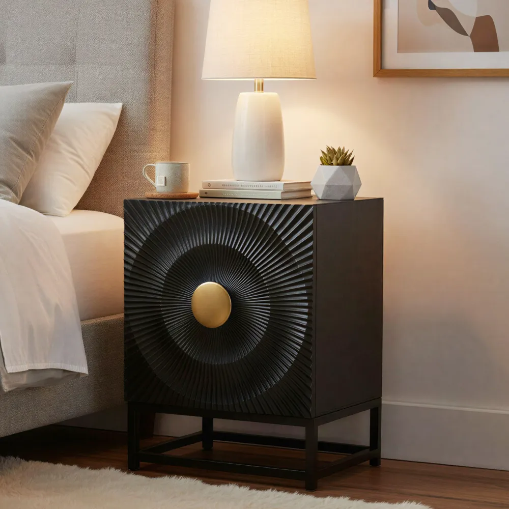 Een nachtkastje is meer dan alleen een praktische opbergruimte – het is een stijlvol element in de slaapkamer. Dit nachtkastje van massief zwart mangohout combineert artistieke details, hoogwaardige materialen en praktische functionaliteit tot een meubelstuk dat design en comfort op het hoogste niveau combineert. Het ronde snijpatroon op de deur geeft het nachtkastje een bijzondere elegantie. De handgemaakte details brengen de natuurlijke schoonheid van het zwarte mangohout naar voren. Het ontwerp wordt afgerond door een gouden metalen handvat dat een luxueus accent legt en perfect harmonieert met het donkere kleurenschema. Gemaakt van massief mangohout staat dit nachtkastje voor duurzaamheid en stabiliteit. Het zwarte metalen frame geeft het ontwerp een modern tintje en creëert een zwevende, lichte look die zelfs kleinere kamers visueel verbetert. Achter het artistiek ontworpen deurtje zit een groot vak dat genoeg ruimte biedt voor boeken, tijdschriften of andere persoonlijke spullen. Zo blijft je slaapkamer opgeruimd zonder aan stijl in te boeten. Als stijlvolle aanvulling naast het bed of als klein kastje in de gang of woonkamer – dit nachtkastje past harmonieus in allerlei interieurstijlen. Het compacte formaat en het tijdloze ontwerp maken het tot een veelzijdig meubelstuk dat elke kamer verfraait.