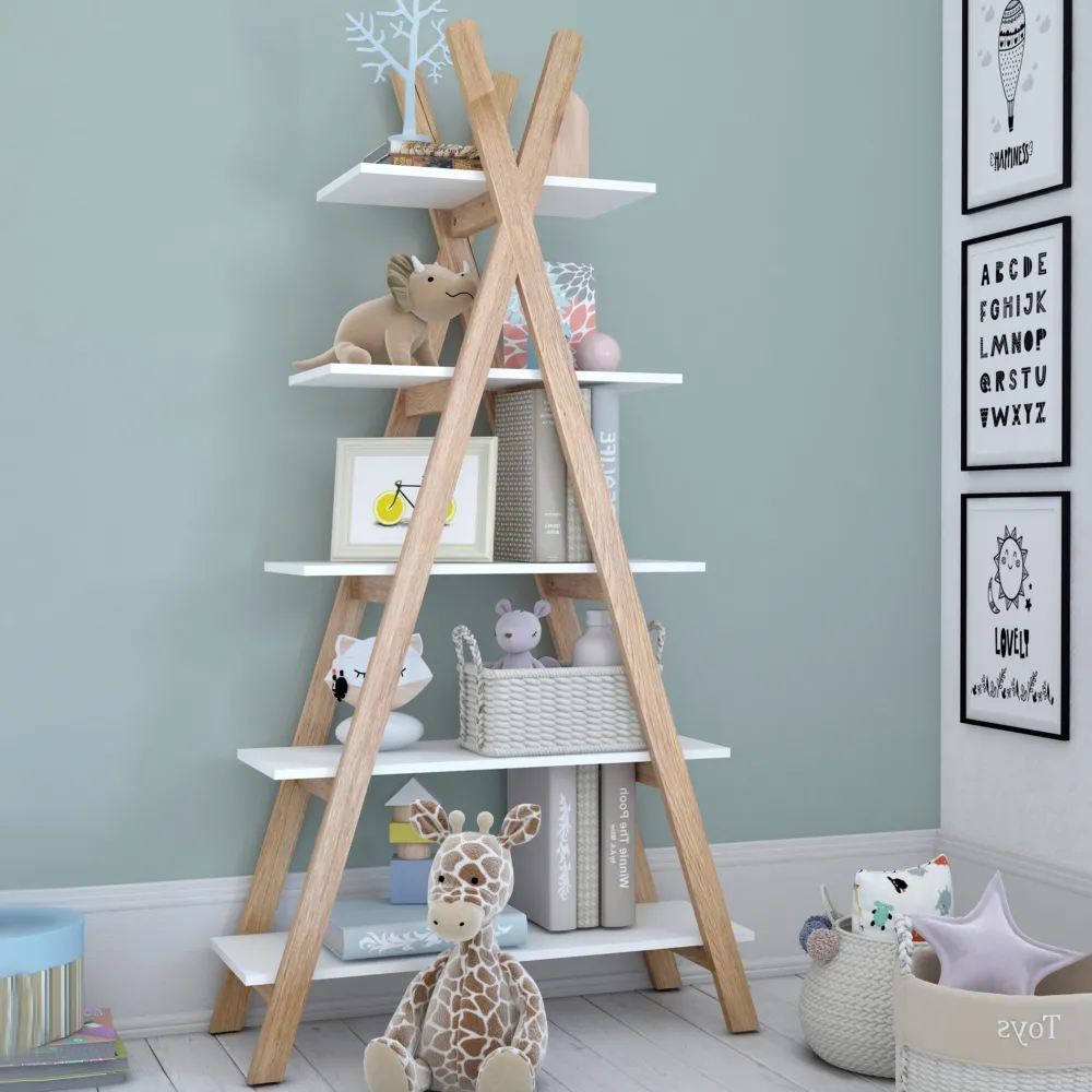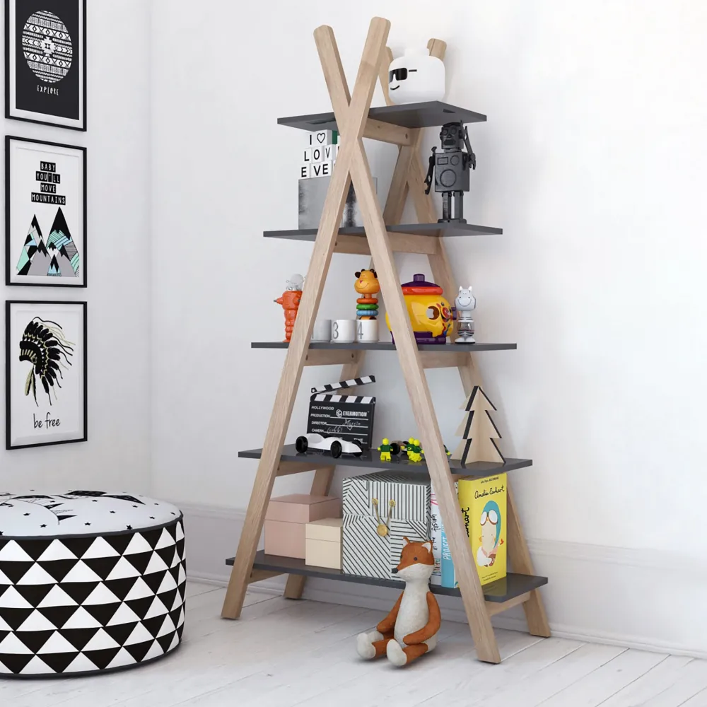Deze plank in tipi-stijl is de juiste keuze voor alle vrolijke indianen. Vijf planken van verschillende lengte bieden veel ruimte voor boeken, speelgoed en decoratieve elementen. De grenen schragen vormen een natuurlijk contrast met de witgelakte MDF vloeren. Het Scandinavisch-moderne ontwerp van de plank past in veel kinderkamerinrichtingen en wordt daar een blikvanger. De tentvormige plank slaat ook een mooi figuur als hij vrij in de kamer wordt geplaatst, bijvoorbeeld als kamerscherm. Ofwel perfect gecoördineerd met de andere meubels uit de collectie ofwel als element in een vrolijke Mix