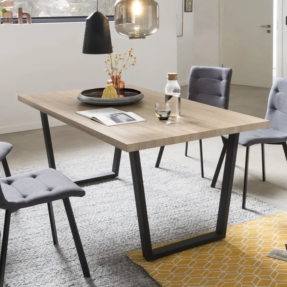 Deze stijlvolle eettafel maakt elke eethoek nog uitnodigender. Voor het tafelblad is hoogwaardig, FSC-gecertificeerd MDF gebruikt. De melamineharscoating maakt het oppervlak goed bestand tegen de algemene spanningen van het dagelijks leven. Het gepoedercoate metalen frame ziet er echt goed uit. De eettafel – in de keuken of in de eetkamer – is in veel appartementen het centrum van het sociale leven. Hier wordt samen gegeten en gedronken, gelachen, gespeeld en gepraat. Ook het werk in de werkkamer aan huis kan zoveel prettiger.