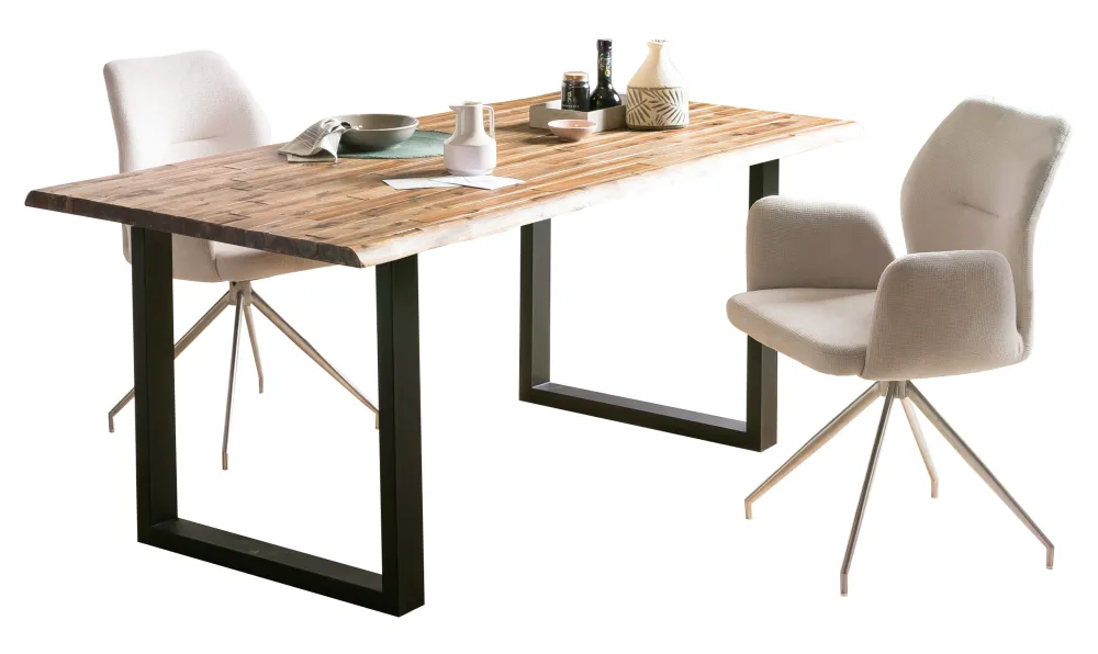 Massief houten meubels van acaciahout zijn een van de tijdloos mooie meubels die nooit uit de mode raken. Het 35 mm dikke tafelblad is gemaakt van acaciahout en wordt met zijn ruwe balkenoppervlak een absolute blikvanger. Bijzonder hoogtepunt: Het U-frame van zwart gelakt metaal geeft de tafel zeer goede stabiliteit en is de passende tegenhanger van het tafelblad in een warme natuurtint. Deze eetkamertafel is meer dan alleen een plek om te zitten en te eten. Breng een stukje natuur in je eigen vier muren. Let op: Omdat deze massief houten tafel een natuurproduct is, kunnen er knoesten of afwijkende kleurversieringen zijn, die echter geen gebreken zijn, maar het individuele karakter van het echte hout onderstrepen.