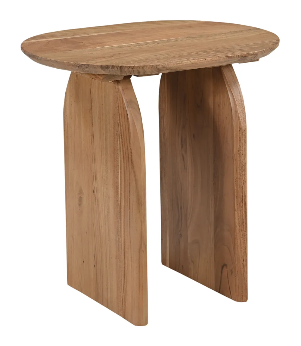Deze elegante bijzettafel van massief acaciahout maakt indruk met zijn tijdloze vorm en hoogwaardige afwerking. Met zijn ovale tafelblad en opvallende frame van houten wangen combineert hij op harmonieuze wijze natuurlijkheid en modern design. Het ovale tafelblad is gemaakt van massief acaciahout, dat bekend staat om zijn stabiliteit en duurzame kwaliteit. De natuurlijke kleur van het hout en de karakteristieke nerf geven de tafel een warme, rustieke uitstraling die elke kamer verfraait. Het zachte, ronde ontwerp van het tafelblad zorgt voor een harmonieus totaalbeeld en brengt een aangenaam woongevoel. Het frame van de tafel bestaat uit robuuste houten wangen, die het meubelstuk niet alleen stabiliteit en een stevige basis geven, maar ook zorgen voor een moderne, heldere esthetiek. Deze constructiemethode onderstreept het natuurlijke karakter van het hout en past perfect in verschillende interieurstijlen. Dankzij het compacte formaat en het doordachte ontwerp is de bijzettafel veelzijdig. Als praktische opbergruimte naast de bank, als stijlvol nachtkastje in de slaapkamer of als decoratief hoogtepunt in de gang of woonkamer – deze tafel biedt flexibel gebruik en zorgt altijd voor een elegant accent in de kamer.