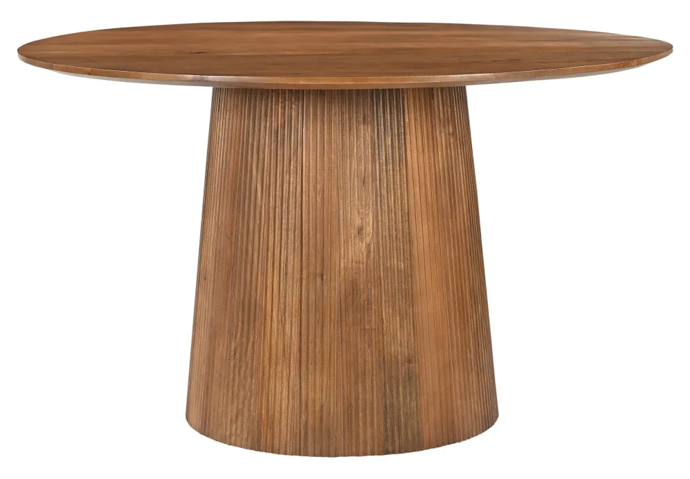 Deze tafel van massief mangohout combineert natuurlijke schoonheid met modern design. Met een compact formaat van 130×130 cm is de tafel perfect voor kleinere tot middelgrote kamers en biedt genoeg ruimte voor een gezellige maaltijd of sociale bijeenkomsten. De ronde vorm creëert een uitnodigende sfeer en bevordert gezellige gesprekken. De tafel is gemaakt van hoogwaardig, massief mangohout en maakt indruk met zijn robuuste constructie en de natuurlijke nerf van het hout, die elke kamer warmte en karakter geeft. Mangohout is niet alleen stabiel en duurzaam, maar ook bijzonder onderhoudsvriendelijk, zodat de tafel jarenlang in onberispelijke staat blijft. Een bijzonder hoogtepunt van deze tafel is het ronde onderstel met latten. Dit geeft de tafel een moderne, maar tijdloze uitstraling en zorgt voor stabiele stabiliteit. Het lattenontwerp voegt een subtiele maar stijlvolle textuur toe aan de tafel, waardoor het een echte blikvanger is in elke kamer. De tafel kan op verschillende manieren worden geïntegreerd in verschillende interieurstijlen en past zowel bij moderne als klassieke interieurs. Of het nu in de eetkamer, keuken of thuiskantoor is – deze tafel brengt natuurlijke elegantie en functioneel design in je huis.