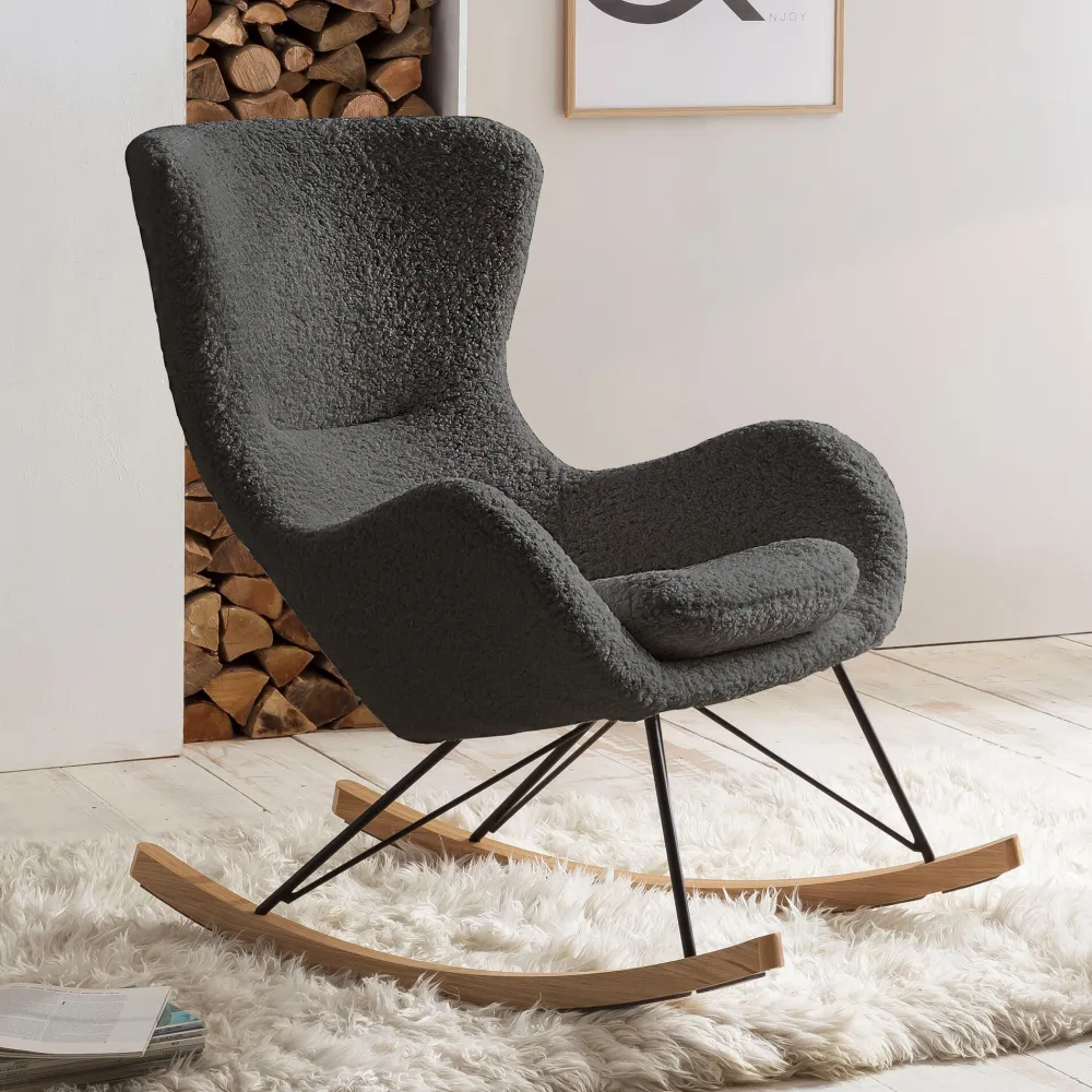 Meubels van teddybont zijn een gezellige woontrend die de woonkamers van designliefhebbers verovert! De schommelstoel in Scandinavische stijl maakt indruk met zijn zachte bekleding van teddybont. Terwijl het frame is gemaakt van zwart gepoedercoat metaal, zijn de twee rails gemaakt van massief hout met eiken fineer. Dit frame zorgt niet alleen voor een gelijkmatige gewichtsverdeling en een mooie beweging van de fauteuil, maar harmonieert ook perfect met de stoffen bekleding. De comfortabele bekleding, armleuningen en het extra dikke zitkussen zorgen voor ontspanning en comfort van een klasse apart. De schommelstoel maakt indruk met zijn opvallende uiterlijk, kwaliteit en duurzaamheid. Maak van deze schommelstoel je nieuwe favoriete plekje en geniet van de gezelligheid tijdens het lezen of tv kijken.