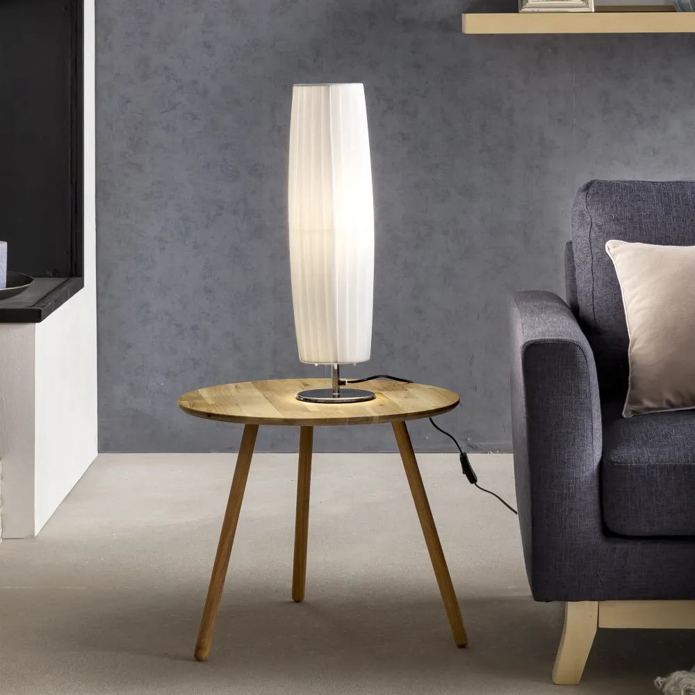 De glamoureuze tafellamp in Art Deco design overtuigt door de combinatie van latex en chromen elementen en is al meerdere malen bekroond door diverse lifestyle magazines. Het geslaagde ontwerp maakt deze lamp zo populair voor het moderne wonen. De geplooide kap bestaat uit een latex doek, dat heel gemakkelijk te reinigen is. De ronde voet in chroomlook zorgt voor een veilige stand en maakt het tijdloze ontwerp perfect. Je kunt deze lamp gemakkelijk in elke woonkamer of kantoor plaatsen en combineren met verschillende interieurs. Het aangenaam warme licht zorgt voor een gezellige sfeer in elke kamer.