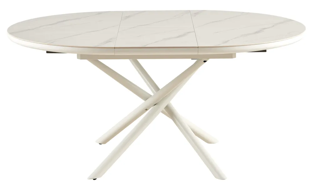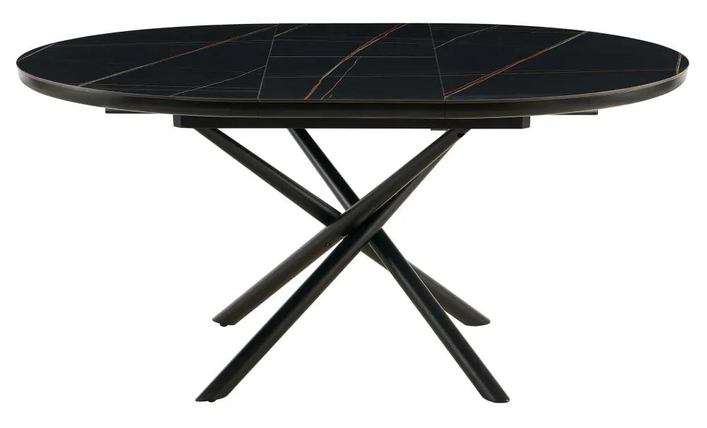 Modern topdesign ontmoet praktisch gebruik. Deze eettafel met uittrekfunctie is niet alleen een visuele blikvanger, de tafel kan ook eenvoudig worden uitgebreid in een paar eenvoudige stappen. Of het nu voor familiefeesten, verrassingsgasten of gezellig samenzijn met vrienden is – de tafel kan eenvoudig worden uitgebreid tot een formaat van 160 x 120 cm met behulp van de twee verlengbladen. Het oppervlak in een minimalistische marmerlook is tijdloos chic en harmonieert perfect met het stervormige designframe. De matte look is de kers op de taart van het moderne ontwerp. Zonder de inzetstukken heeft de tafel een diameter van 120 cm. Ronde tafels besparen ruimte, vooral in kleinere eetkamers, en maken gezellige gesprekken mogelijk als je bij elkaar zit.