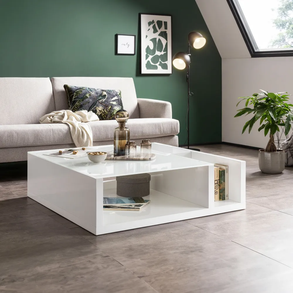 Deze moderne salontafel valt meteen op door zijn elegante accenten. De complete banktafel is gemaakt van onderhoudsvriendelijk MDF en gelakt in hoogglans wit. Het tafelblad van wit veiligheidsglas is 12 mm dik en rondt het moderne uiterlijk af. Het open opbergvak onder het tafelblad en de twee extra vakken aan de zijkanten zorgen voor veel opbergruimte. Hier zijn voldoende opberg- en legmogelijkheden voor drankjes, snacks, tijdschriften of dergelijke. Deze woonkamertafel past heel goed in reeds bestaande interieurs. Bijzonder opvallende contrasten kunnen worden gecreëerd met lichte of donkere meubelkleuren, zoals de modieuze zwart-wit contrasten.