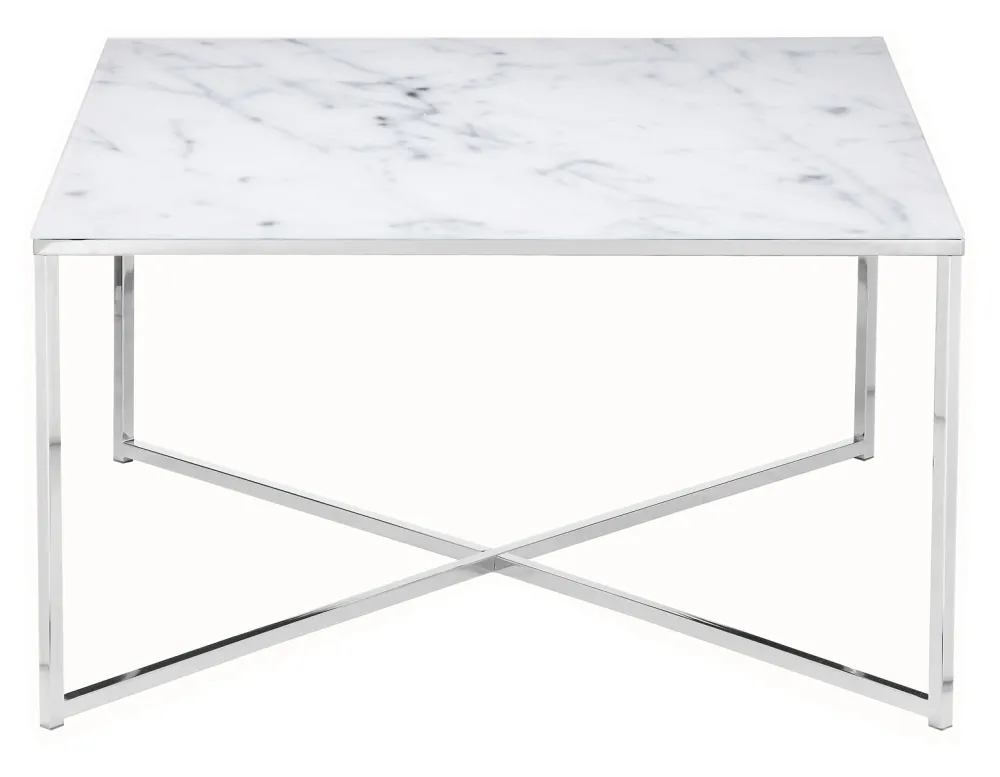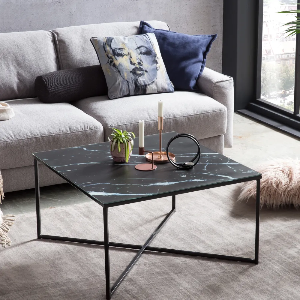 De vierkante salontafel combineert modern design met een dosis extravagantie. Het glazen blad met onderliggende marmerlook folie past perfect bij het zwart metalen frame. De banktafel biedt voldoende opbergruimte voor bijvoorbeeld tijdschriften, fruit, knabbels of een bloemenvaas. Dankzij het aantrekkelijke ontwerp en de vierkante vorm is deze salontafel met veel meubels te combineren en zal hij ook in jouw huis een passende plaats vinden.