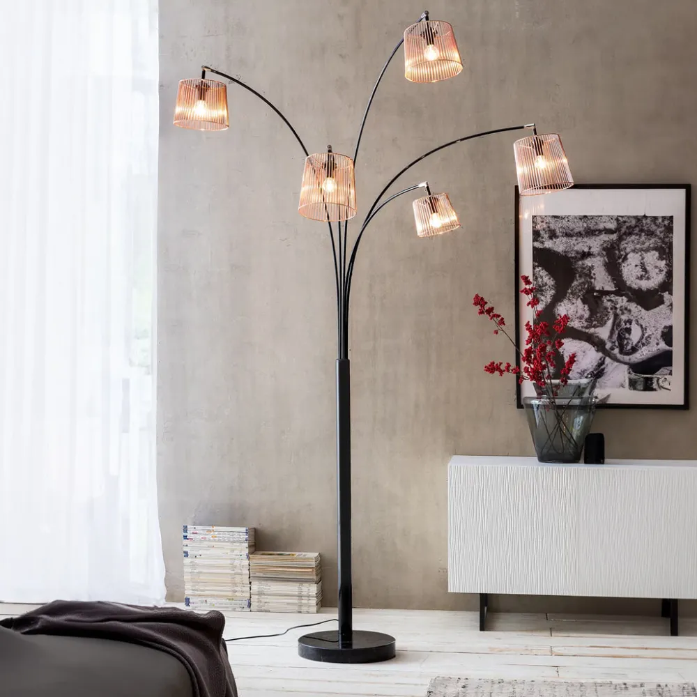 De stijlvolle vloerlamp is bekend uit vele lifestyle- en interieurbladen. Dit extravagante model is een absolute blikvanger in je woonkamer. Aan het einde van elk van de 5 vrij zwenkbare lampbogen is een draaibare lichtcapsule van koper bevestigd. Deze lichtelementen hebben verschillende afmetingen. Zo ontstaan vele mogelijkheden om je woonruimte individueel te verlichten. De 5 lampenkoppen lijken op een kooi en zijn uitgevoerd in modern koper. Het frame is van metaal en de zware en mooie voet is van marmer. Dit ziet er niet alleen extravagant uit, maar biedt de vloerlamp ook een enorme stabiliteit. De lamp wordt handig in- of uitgeschakeld via een voetschakelaar met geïntegreerde dimmer. Dankzij de kantelbare en draaibare armen van verschillende lengte kan deze lamp in elke lees- of tv-hoek worden geïntegreerd. Het aangenaam warme licht zorgt voor een gezellige sfeer in elke kamer, die je steeds weer kunt veranderen. Er zijn geen grenzen aan je creativiteit.