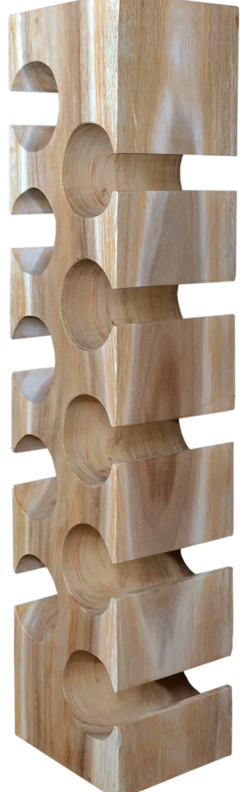 Het wijnrek Etoya van Artistiq Living is een stijlvol en speels meubelstuk van warm suarhout. Het verticale ontwerp met openingen biedt ruimte voor 10 flessen wijn en presenteert ze op een aantrekkelijke en overzichtelijke manier. Dankzij het open karakter blijft het wijnrek luchtig en licht, waardoor het gemakkelijk in verschillende ruimtes past, van de keuken tot de eetkamer of het dressoir.