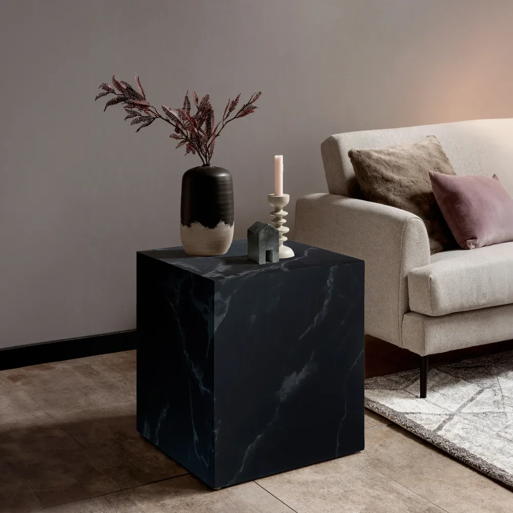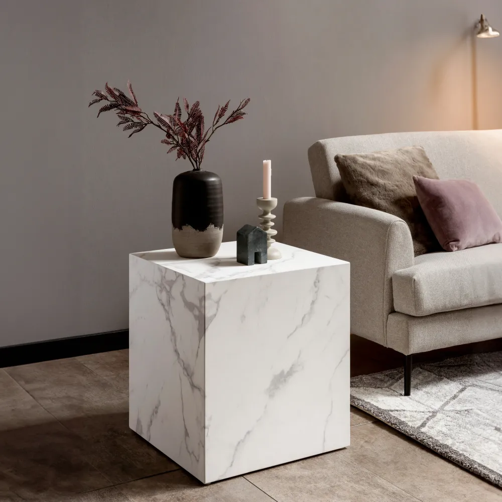 Deze chique bijzettafel laat je woonkamer er veel eleganter uitzien. De eenvoudige kubusvorm met veel oppervlak laat de geweldige witte marmerlook goed tot zijn recht komen. De bijzettafel is veelzijdig, niet alleen naast de salontafel, maar ook als nachtkastje of als vrijstaande blikvanger.