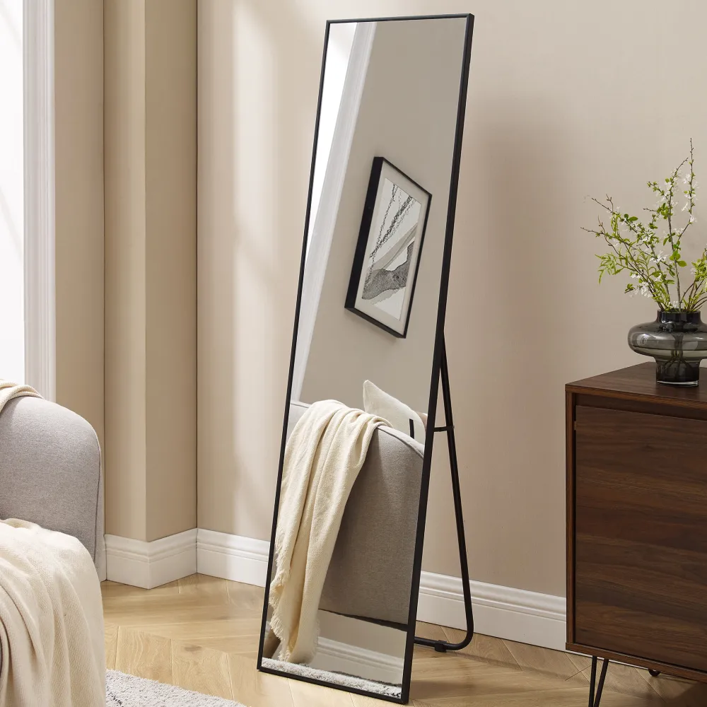 Een staande spiegel is meer dan alleen een functioneel element – hij brengt stijl en elegantie in je huis. De spiegel over de volle lengte met een stijlvolle zwarte aluminium lijst is de perfecte aanvulling voor de slaapkamer, badkamer, hal of woonkamer. Met zijn afmetingen van 40×150 cm biedt hij een helder, volledig zicht en past hij moeiteloos in elke kamer. Het slanke, hoogwaardige aluminium frame in diepzwart geeft de spiegel een tijdloze elegantie en zorgt voor een modern, minimalistisch ontwerp. Dankzij de inklapbare standaard kan de spiegel flexibel worden opgesteld en ruimtebesparend worden opgeborgen. Deze spiegel is de ideale keuze voor iedereen die op zoek is naar functionaliteit en stijl in één – perfect om een geraffineerd tintje aan je huis te geven.
