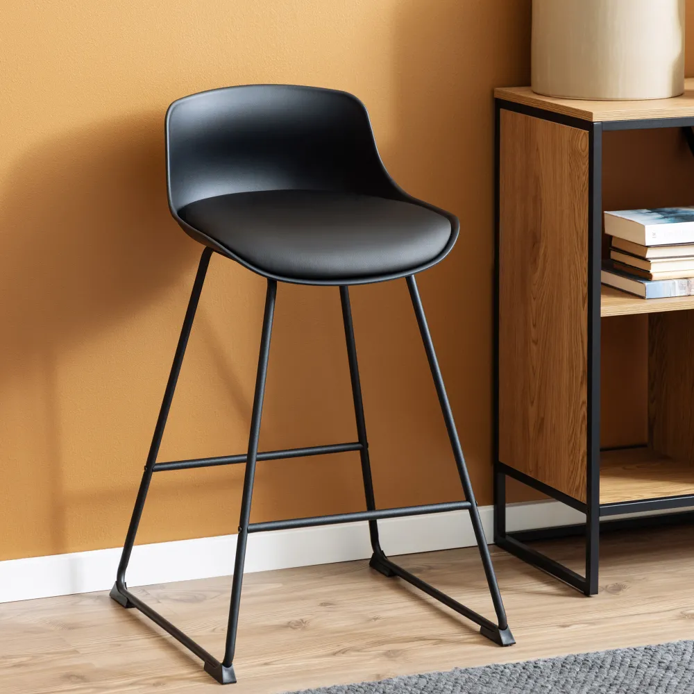 Naarmate de ruimtes kleiner worden, neemt de behoefte aan praktisch meubilair toe. Deze zwarte set van 2 barkrukken is dé oplossing voor huizen met beperkte keukenruimte en hun eigenaren, die een zwak hebben voor esthetiek. De barkruk neemt niet veel ruimte in beslag. De slanke zwarte metalen sleevoet, voorzien van een voetensteun, en de vloeiende zwarte zitting, geven de kruk een lichtgewicht uitstraling. De moderne zitting heeft een korte rugleuning en wordt geleverd met een zitkussen van kunstleer voor comfortabel zitten.