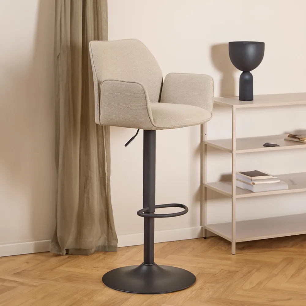 De in hoogte verstelbare barkruk met armleuning verheft elk huis met zijn eigentijdse silhouet en is versierd met een gestructureerde beige stof en een biesdetail, wat de kruk een getextureerde look geeft. Aangevuld met de zwarte trompetvoet met draaifunctie en voetsteun, combineert de barkruk stijl en functionaliteit.