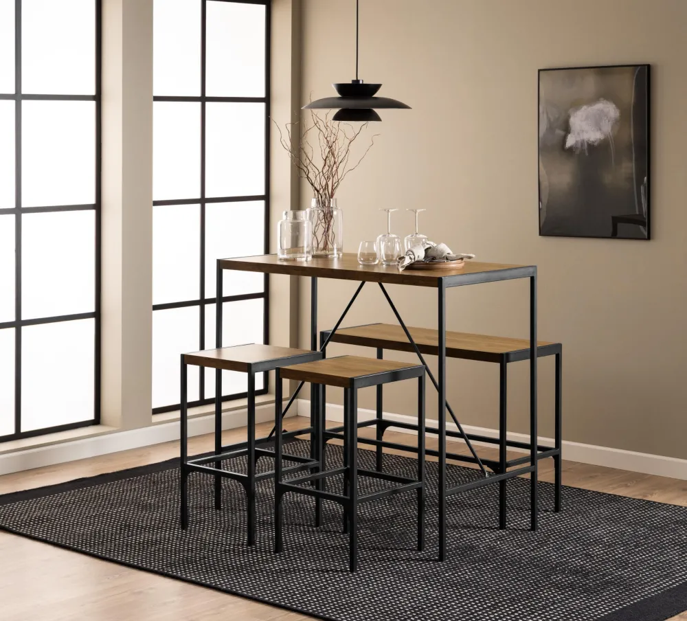 Geef je eetkamer de charme van een oude industriële ruimte met deze bartafelset. Geïnspireerd door de stedelijke lofts en fabrieken, zet de combinatie van zwart staal en rustieke eiken look meteen de sfeer voor een ongedwongen eetervaring. Hij bestaat uit een bartafel, een bankje en 2 barkrukken en het enige wat nog ontbreekt is goed gezelschap met heerlijk eten.