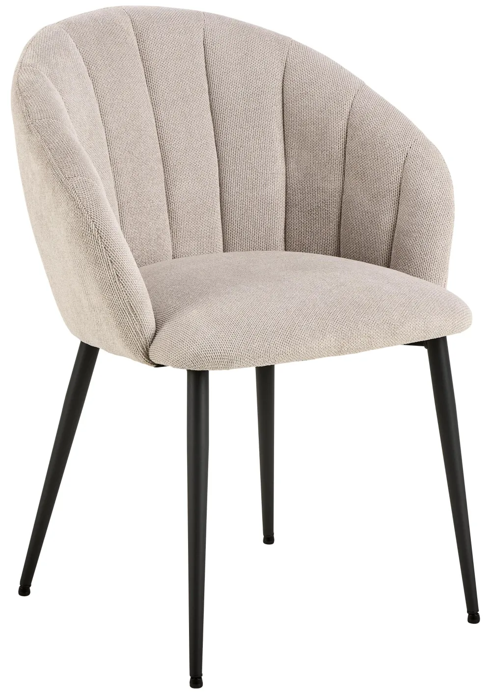 Geniet van deze eetkamerstoel en de details – hij zal de kamer niet overnemen maar een vleugje elegantie toevoegen. De afgeronde rugleuning en het verticale stiksel detail geven hem dat stijlvolle gevoel waardoor je twee keer zult kijken. De dunne zwarte stalen poten vormen een mooi contrast met de beige bekleding.
