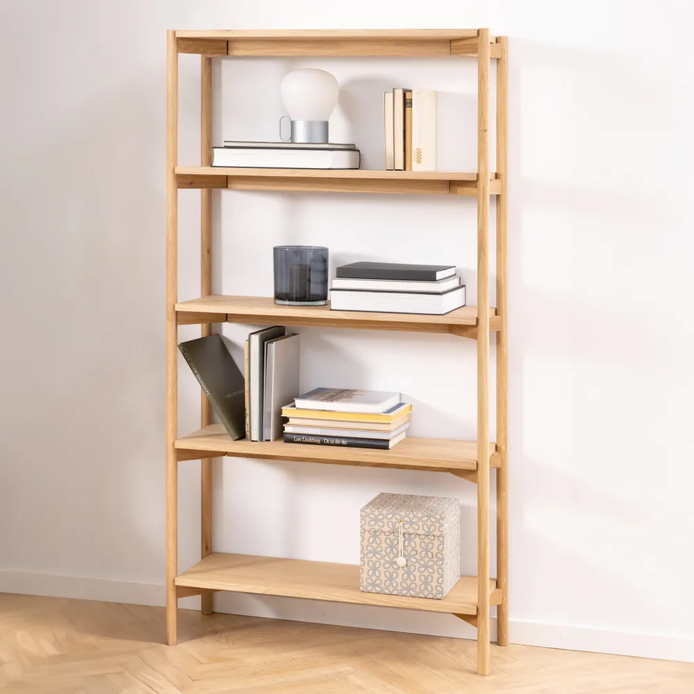 Wandrek Calais van Bendt heeft een strakke en eigentijdse uitstraling dankzij het eikenhouten frame en de planken van eikenfineer in naturel kleur. Met vier planken biedt het rek ruimte om boeken, planten of stijlvolle accessoires neer te zetten.