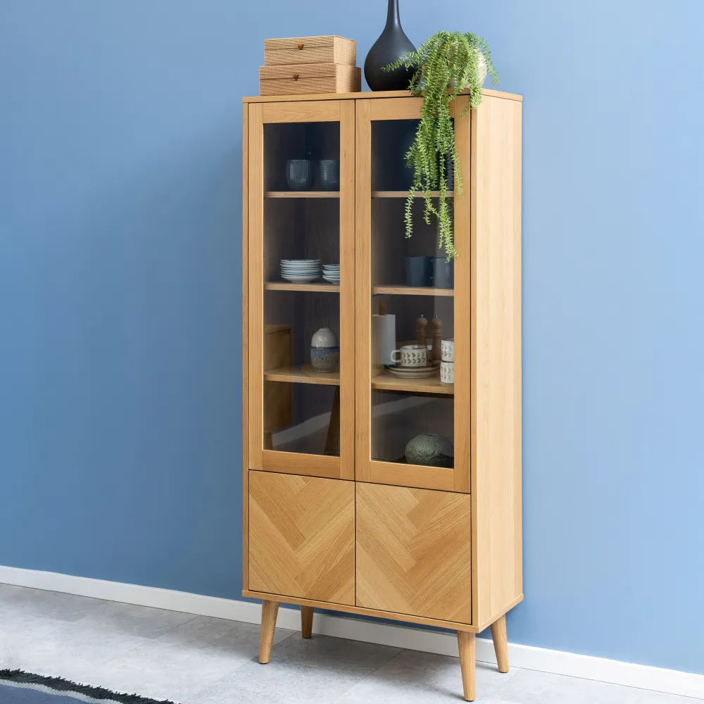 Of het nu gaat om servies, boeken of souvenirs van reizen, ze verdienen allemaal hun eigen speciale plekje. Dit kastje kan jouw collectie beschermen tegen stof en mogelijke ongelukjes. Pas de planken zelf aan om ervoor te zorgen dat jouw favorieten de beste plek hebben. Gemaakt in de mooiste eikenhouten tint, met visgraatpatroon en geïntegreerde handgrepen, is dit kastje de definitie van must-have meubels.