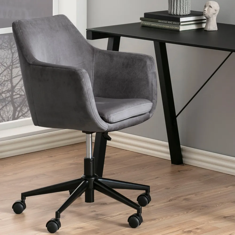 De perfecte bureaustoel voor het thuiskantoor – deze stoel wordt gekenmerkt door een eigentijdse stijl en een klassiek silhouet. De comfortabele gestoffeerde zitting en verzonken armleuning maken deze bureaustoel perfect voor als je thuis werkt. Deze bureaustoel heeft een in hoogte verstelbare zitting, multidirectionele wielen en een draaifunctie. De mooie fluwelen stof voelt opvallend zacht aan en geeft de stoel diepte. Door het fluweel zal het stuk van kleur veranderen afhankelijk van het licht en de richting van de pool, waardoor het een levendige rijke uitstraling krijgt.