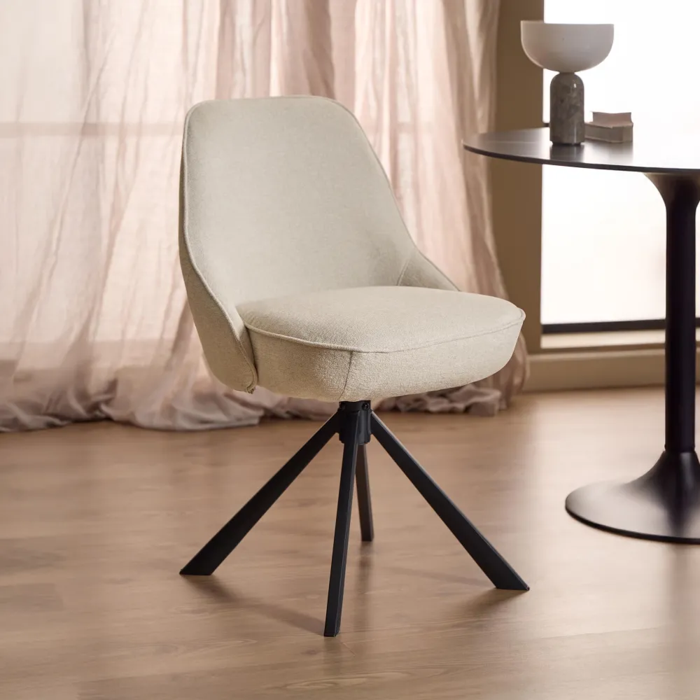 Met zijn ronde vormen en biezen voelt deze eetkamerstoel uitnodigend aan. Verrijkt met pocketveren biedt de stoel een geweldig zitcomfort. De beige chenille bekleding valt op door het zachte gevoel. In combinatie met een zwart 4-sterren onderstel van staal kun je de stoel gemakkelijk draaien dankzij de draaifunctie.