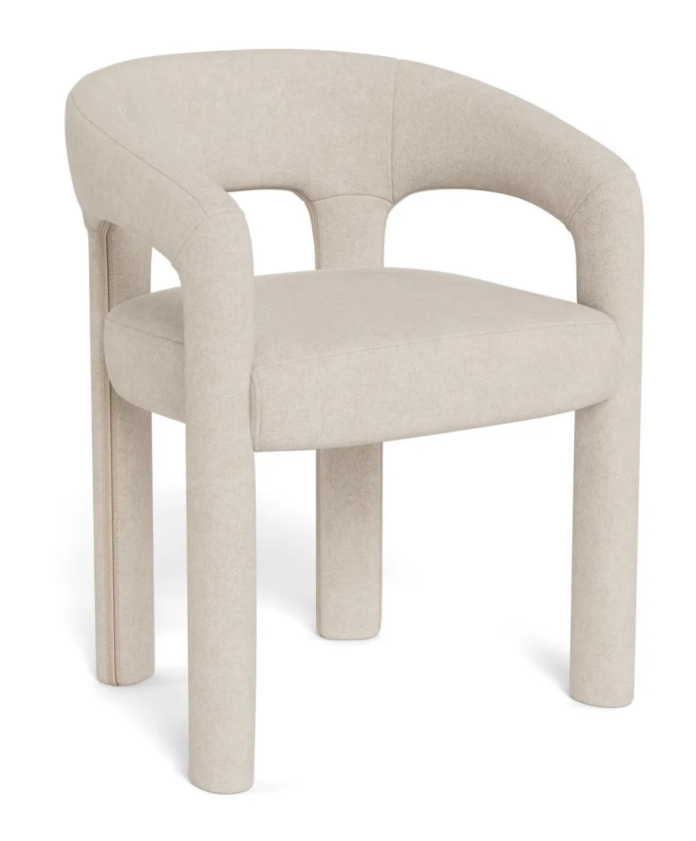 Ontdek moeiteloze elegantie met deze beige eetkamerstoel met armleuningen, bekleed met een moderne stof met chenille garens. De zachte textuur en pocketveren zorgen voor een uitnodigende zit die comfort en stijl combineert, perfect om een verfijnde touch aan je eetervaring toe te voegen. Deze stoel past gemakkelijk bij elke eettafel.