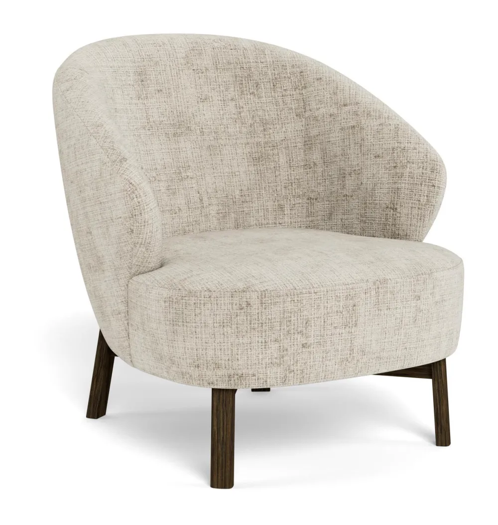 Deze fauteuil heeft een modern design zonder concessies. De strakke, ronde zitting is bekleed met een zachte beige stof met een levendige textuur. Dankzij de pocketveren in de zitting zit de stoel supercomfortabel en voelt hij heerlijk aan. Hij staat op gelakte houten poten van gerookt eikenhout.
