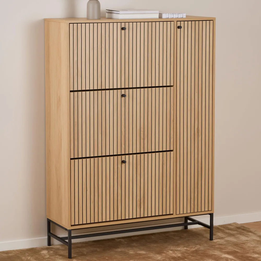 Verfraaid in een eiken look met een lamellenfront voegt deze schoenenkast stijl en functionaliteit toe aan je gang. De geometrische elementen spelen met visuele diepte en brengen het oppervlak tot leven. Met 3 compartimenten benut het je ruimte en berg je je schoenen discreet uit het zicht op.