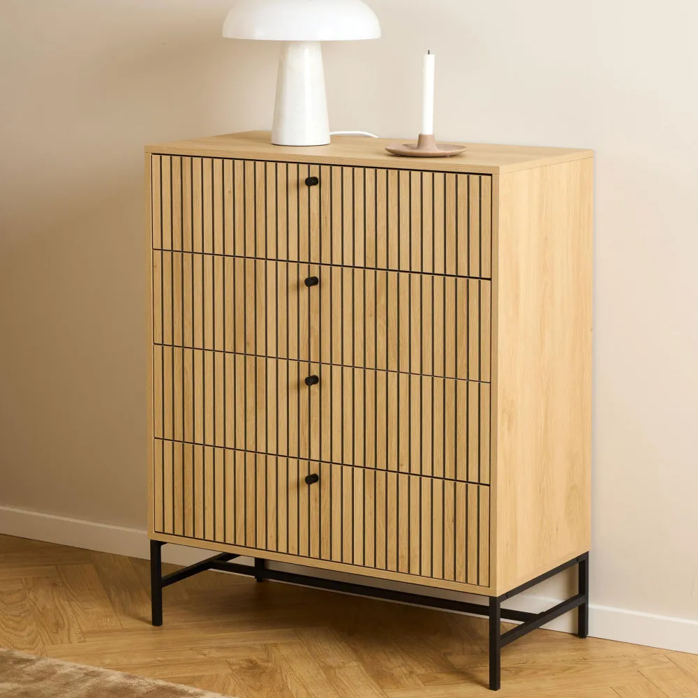 Verfraaid in een eikenhouten look met een lamellenfront, weet deze commode de aandacht te trekken. Door te spelen met contrast creëert de eiken look aangevuld met zwarte accenten een evenwichtige visuele aantrekkingskracht. Met 4 lades biedt de ladekast voldoende opbergruimte, terwijl het onderhoudsvriendelijke oppervlak het praktische aspect versterkt.