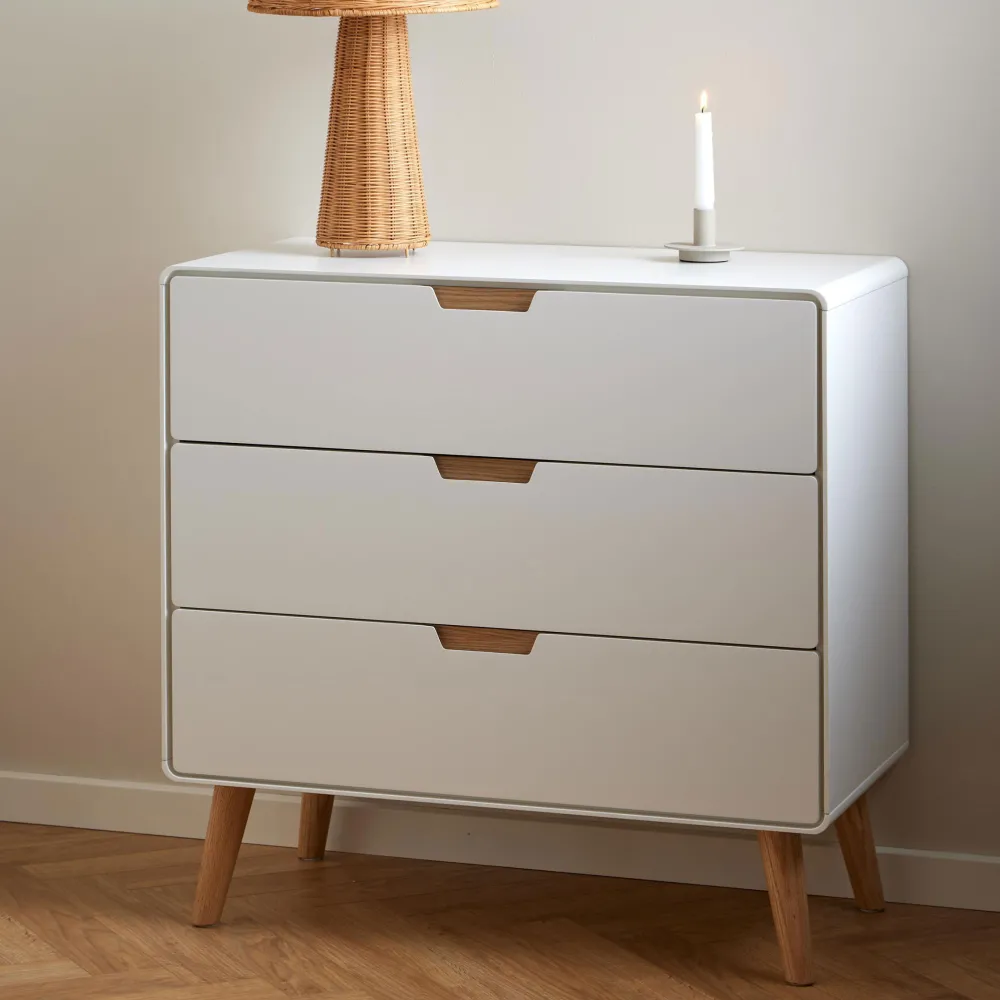 Deze ruime ladekast met 3 lades biedt voldoende opbergruimte voor je kleding, speelgoed en boeken. De witgeschilderde lade past met zijn minimalistische uitstraling in bijna elke kamer. De eikenhouten details vullen de algehele esthetiek goed aan. Het is een opbergoplossing die functionaliteit en design moeiteloos combineert.