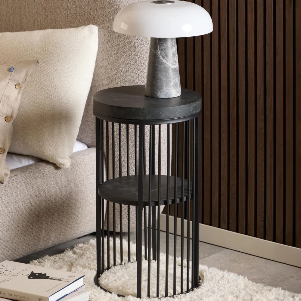 Dit staande nachtkastje is geïnspireerd op hedendaagse architectuur en lijkt met zijn vorm en gedaante op een zuil. Het blad en de plank, met een zwart marmeren look, worden omgeven door verticale draden, waardoor het nachtkastje open en toch gesloten aanvoelt. Het dynamische samenspel van elementen creëert een opvallend effect dat een blijvende indruk achterlaat.