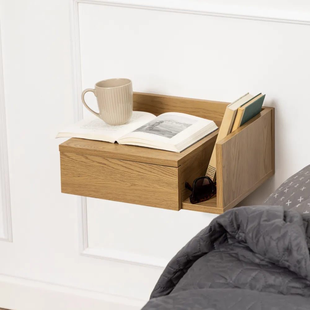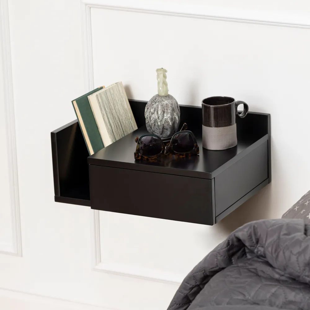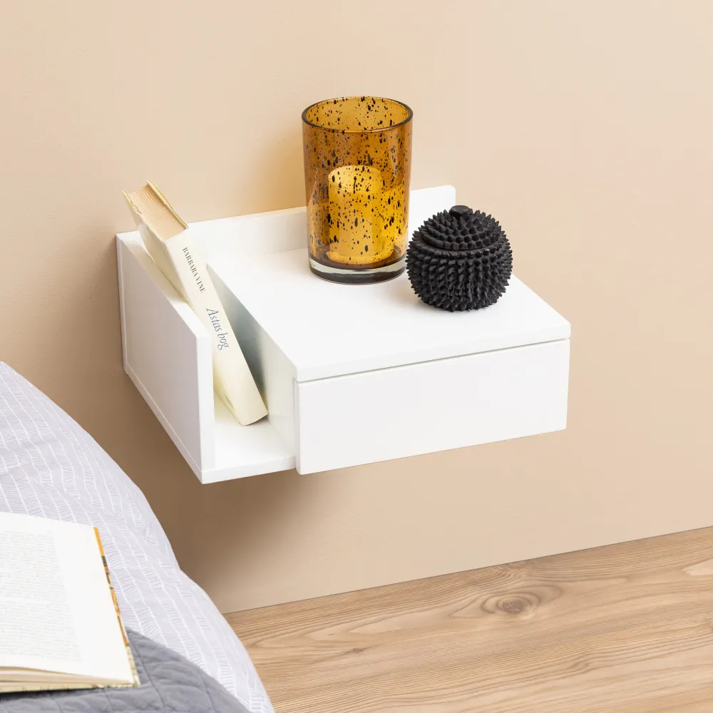De ideale partner voor elke slaapkamer als je van een minimalistische, strakke look houdt. Met strakke lijnen en een wit geverfde oppervlakte zal dit nachtkastje niet de overhand nemen in je slaapkamer. Hang het aan de muur naast je bed op de hoogte die je wenst. Er is ruimte voor tijdschriften naast de lade – bij het monteren van de tafel beslis je aan welke kant je het open compartiment wilt hebben. Met 1 lade heb je ruimte voor boeken, glazen en wat je ook nodig hebt.