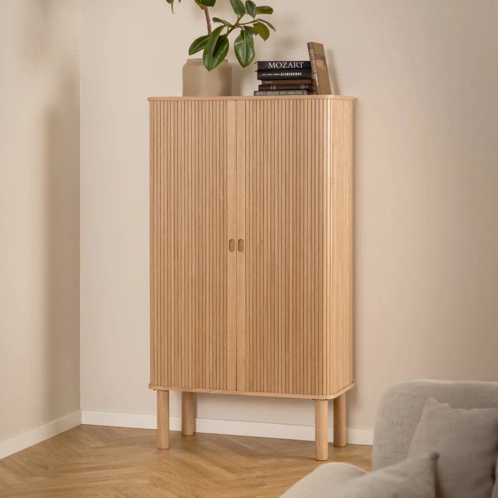 Het latjesfront geeft ritme en diepte aan het ontwerp, terwijl de ronde hoeken zorgen voor een zachte, elegante afwerking. De roldeuren schuiven soepel open en onthullen twee strak ingedeelde planken. De volledig gelakte afwerking benadrukt de natuurlijke houtkleur en het vakmanschap. Alandria straalt rust, eenvoud en verfijning uit – een opbergmeubel met tijdloze allure.