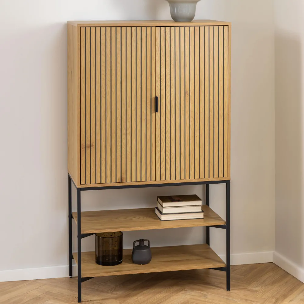 Dit kastje laat zien hoe het moet. Met zijn onberispelijke, minimalistische uitstraling is het meer dan alleen een plek voor je spulletjes – het zal de toon zetten in elk huis. Kijk maar naar die lamellenfronten met de elegante handgrepen in hetzelfde ruwe poedergecoate metaal als de basis. Het kastje heeft verstelbare planken om aan jouw behoeften te voldoen.