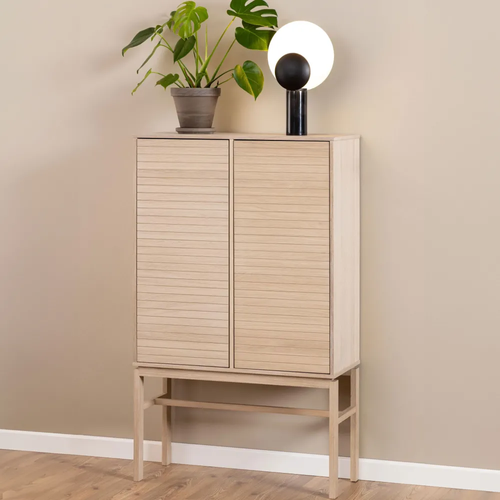 Deze kast biedt zowel opslag als een harmonieus ontwerp en zal een perfecte aanvulling zijn op zowel moderne als traditionele ruimtes. Verberg je spulletjes op de vier verstelbare planken achter de twee deuren – en als je toch bezig bent, vergeet dan niet die lamellenfronten te bewonderen die voor een interessant detail en optische illusie zorgen.