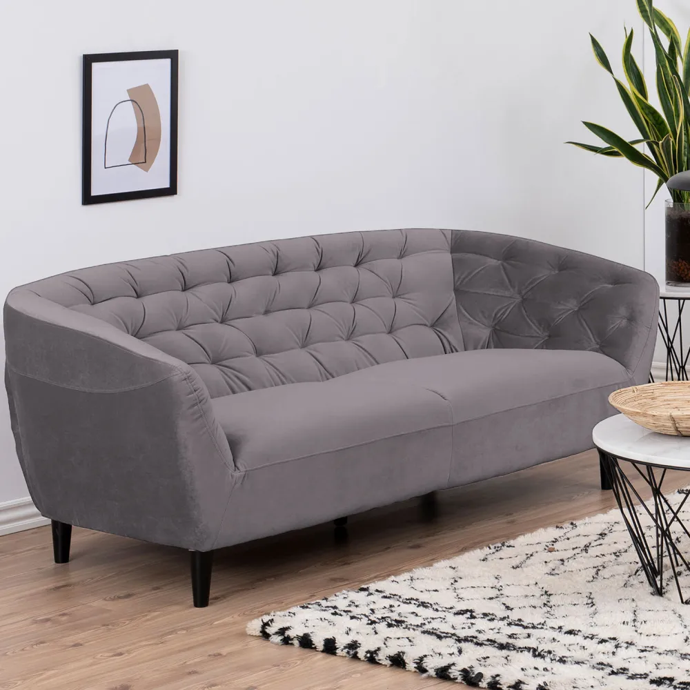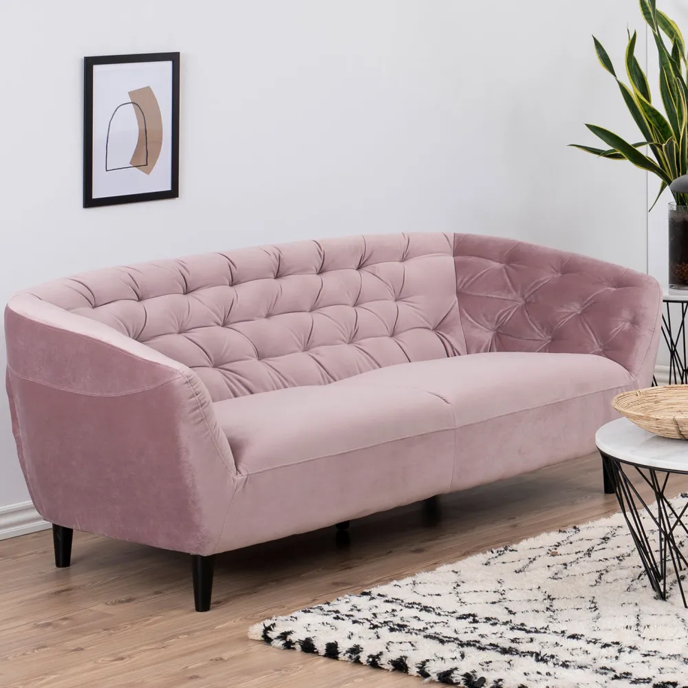 Deze roze 3-zitsbank met een rond karakter zit boordevol stijl. Het fluwelen oppervlak zorgt voor een zachte sensatie, terwijl de pocketveren voor veel comfort zorgen en de lounge-ervaring verbeteren. Van het vrouwelijke tuftdetail tot de ronde, taps toelopende zwarte poten straalt deze bank een klassieke esthetiek uit.