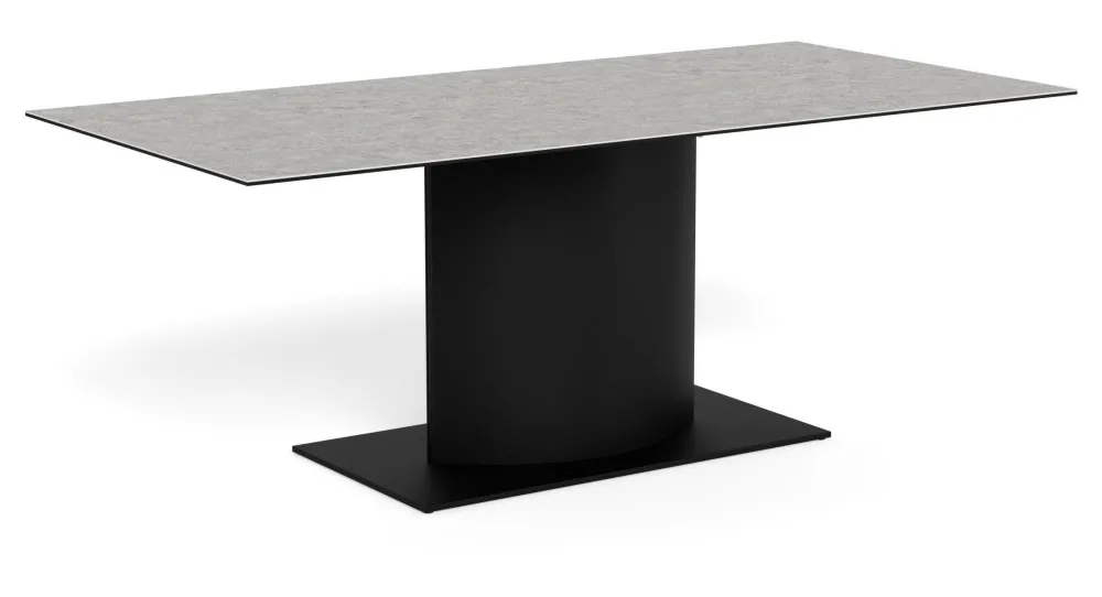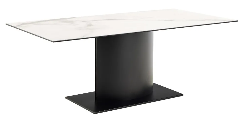 Deze eettafel viert de schoonheid van geometrie en rechte lijnen. Het slanke rechthoekige tafelblad rust op het onderstel met zwarte panelen en is gemaakt van een wit ruw keramisch oppervlak – ideaal voor dagelijks tafelen vanwege de praktische eigenschappen, waardoor het oppervlak krasvrij blijft. Zo’n opvallend ontwerp blaast nieuwe energie in elke eetkamer.