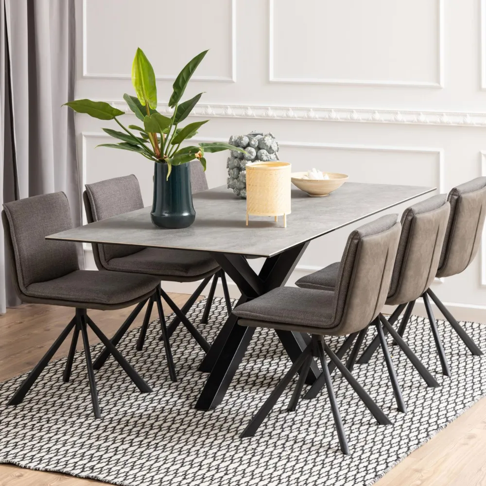 Een zelfgemaakte maaltijd delen met je geliefden wordt nog gezelliger met deze eettafel. Hij biedt comfortabel plaats aan 6 personen en wat esthetiek betreft geeft de combinatie van het grijze tafelblad en de sculpturale kruisvoet in zwarte kleur de tafel een gedurfd karakter. Gemaakt van het hitte- en krasbestendige keramiek en stevig staal, is deze tafel ideaal voor dagelijks gebruik en feestelijkheden.