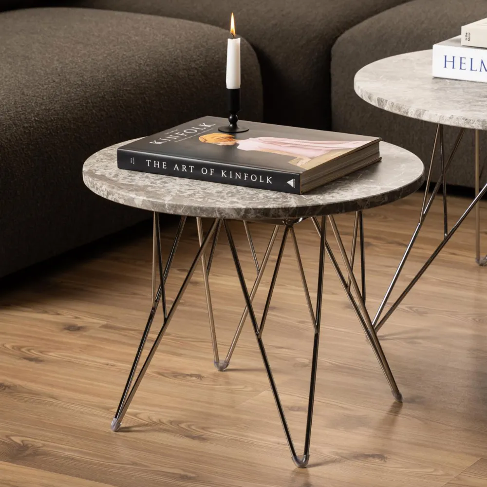 Deze bijzettafel zal zowel minimalisten als maximalisten aanspreken. Het heeft een visueel opvallend blad van grijsbruin marmer, ondersteund door een verchroomd draadonderstel. Het evenwichtige contrast tussen de verhoudingen geeft het ontwerp een luchtige charme. Het past gemakkelijk bij allerlei interieurstijlen.