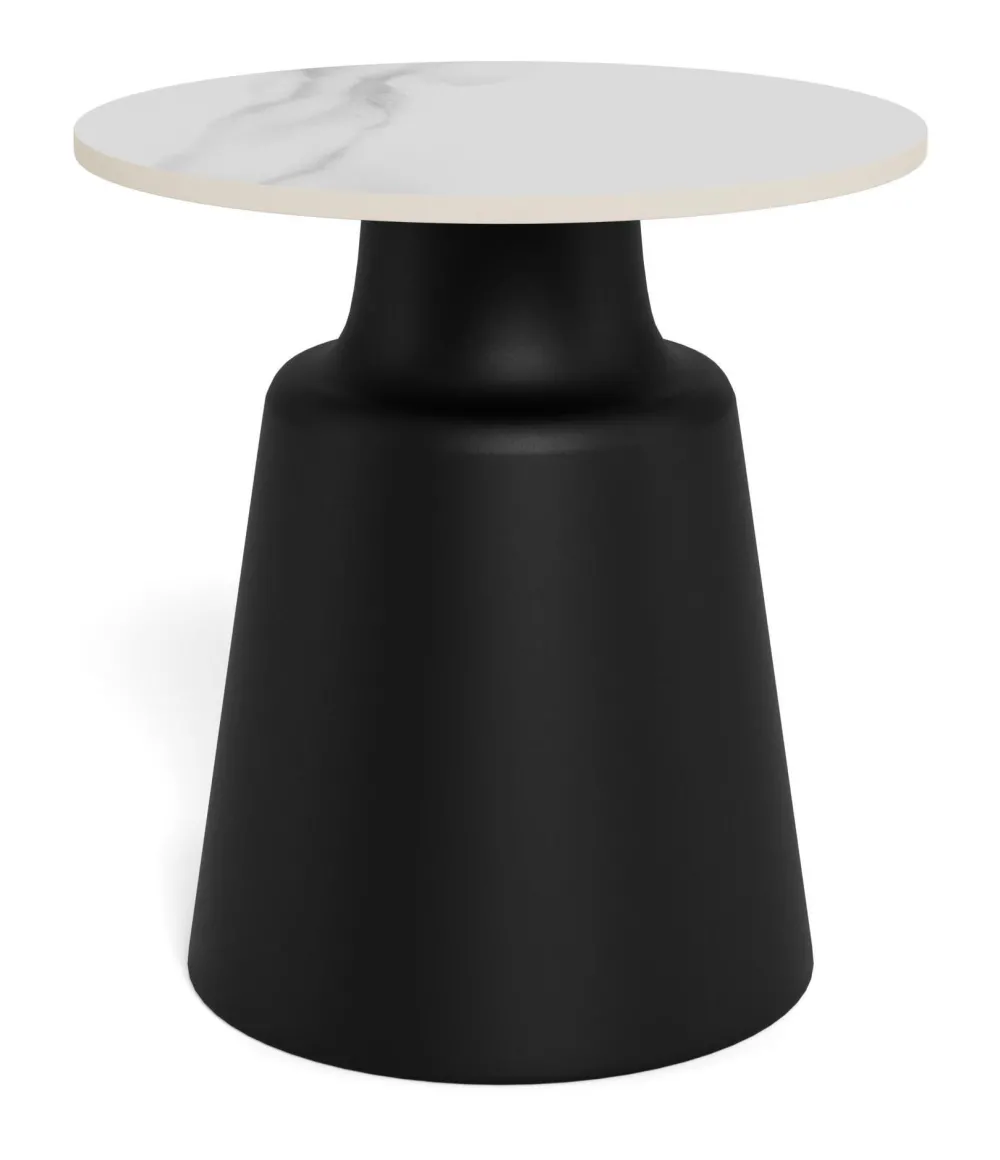 Deze ronde salontafel stapt met zijn opvallende uitdrukking uit de conventies. Met een rond blad van keramiek en een zwarte robuuste stalen kolomvoet brengt hij een levendige energie in de woonkamer. Het witte blad doet denken aan marmer met zijn aderen, maar is hitte- en krasbestendig.