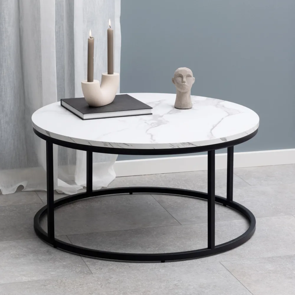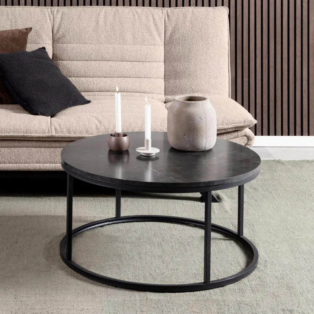 De ronde salontafel ‘Flemming’ uit de collectie van het Deense merk Bendt combineert modern design met tijdloze elegantie. Het tafelblad van melamine met marmerlook biedt de luxe uitstraling van marmer, terwijl het materiaal duurzaam en onderhoudsvriendelijk blijft. Het gepoedercoate stalen onderstel met ronde vorm geeft de tafel een strakke en eigentijdse uitstraling.
